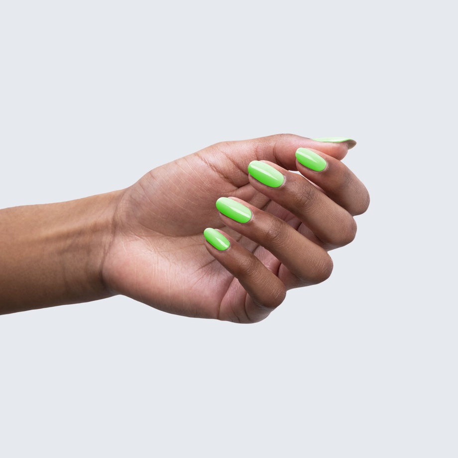 Neon green. Bright. Cool undertone. Medium opacity (slightly translucent).